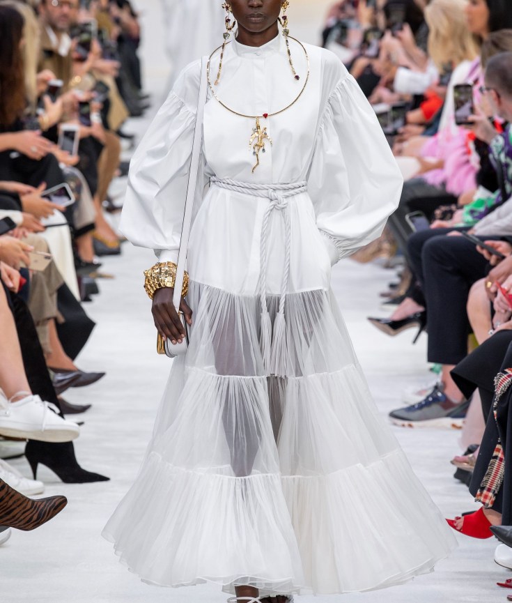 Este outfit de Dior tiene todo lo que está bien: encajes de algodón, capas de tul bordado, colores terrosos y motivos de naturaleza.