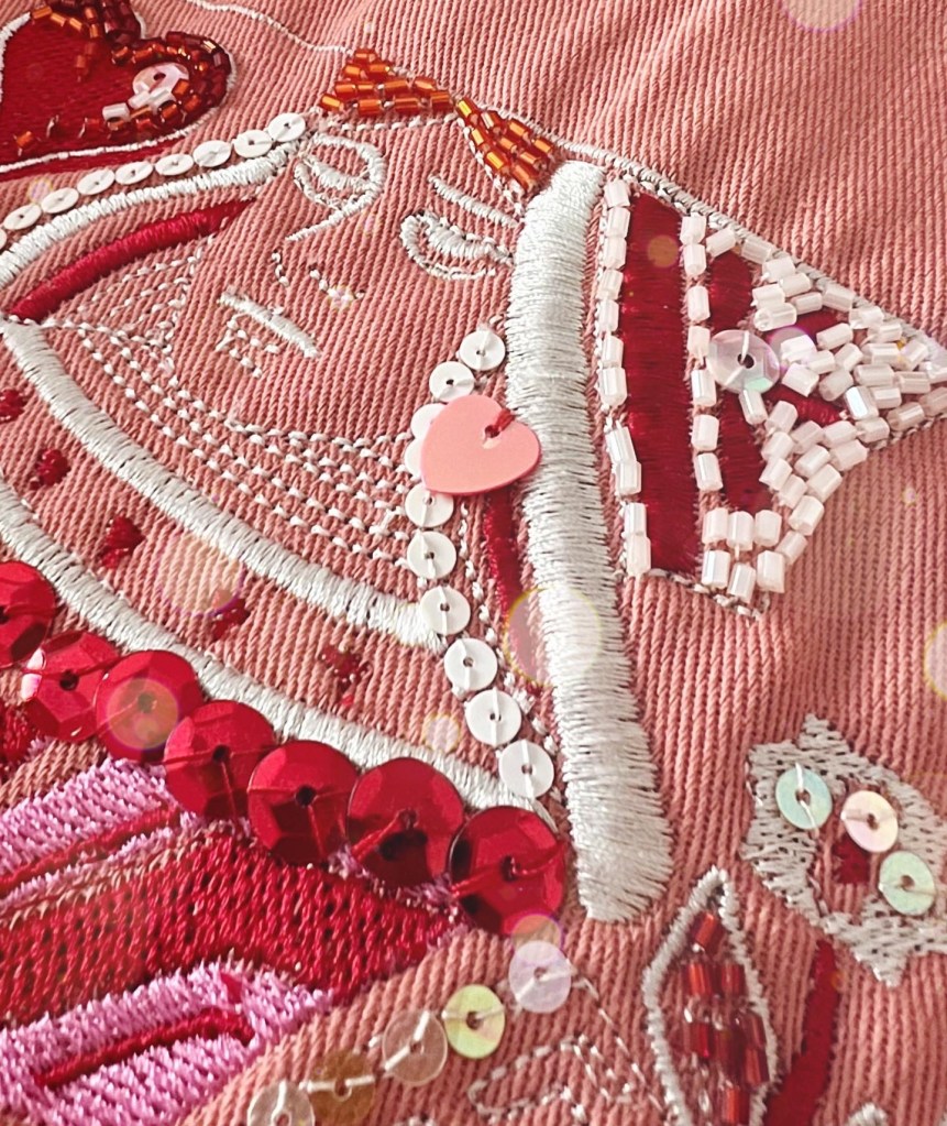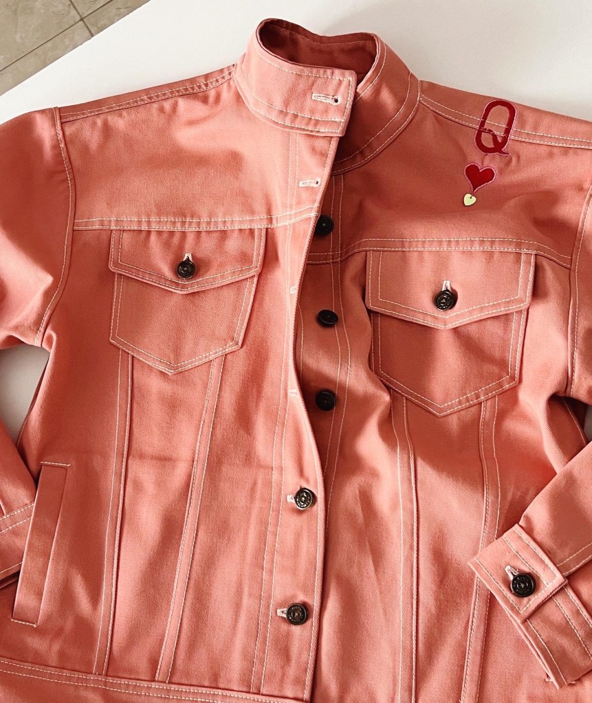Se va terminando el año y en Noviembre comencé otra chaqueta de Denim (porque si no me hago 1 ó 2 chaquetas de Denim por año, no soy feliz), esta vez en un rosa salmón y un bordado que diseñé copiando un naipe de Reina de Corazones.