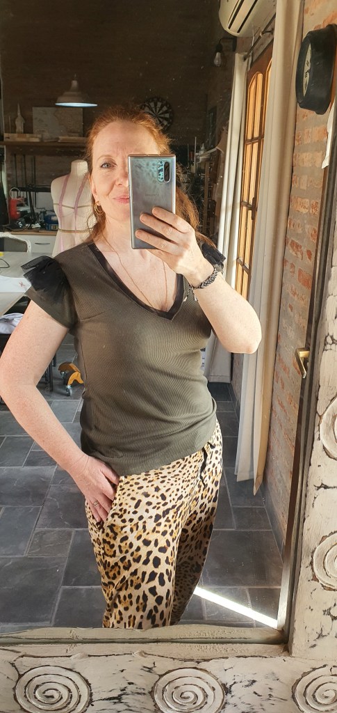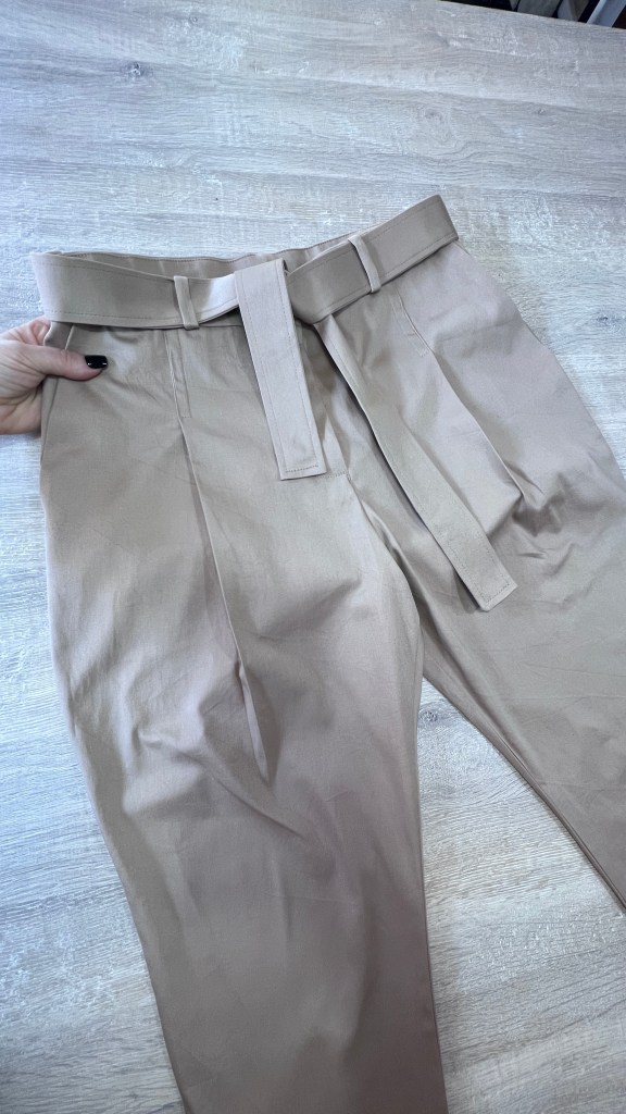 Al volver, compré 3 metros de gabardina de algodón verde salvia y la transformé en dos prendas que pueden encontrar en mi show de patrones en PDF: el Pantalón Gabriela y la Chaqueta Oriente.