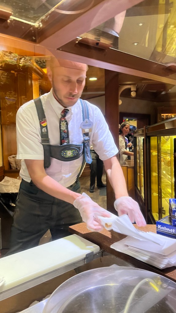 Con esta concentración y amabilidad, me atendieron alemanes tiroleses en esta dulcería germana en Epcot: