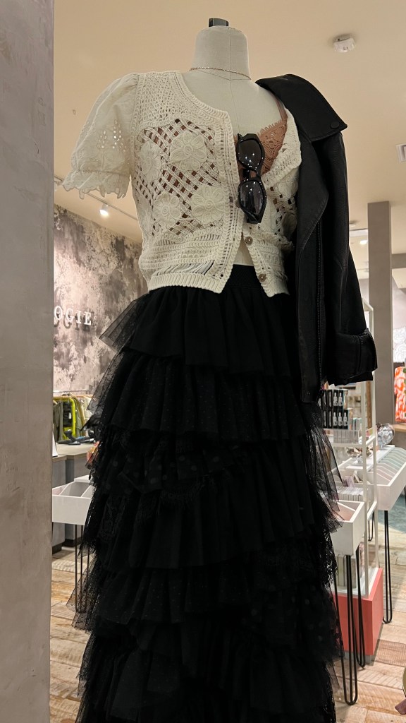 Y de estos conjuntos de sweaters tejidos al crochet y faldas con capas de tul:
