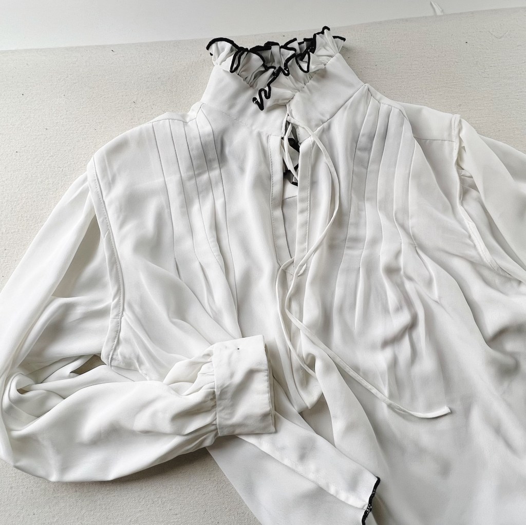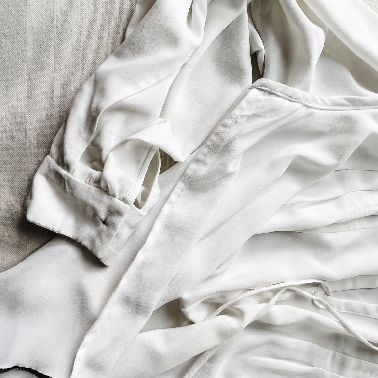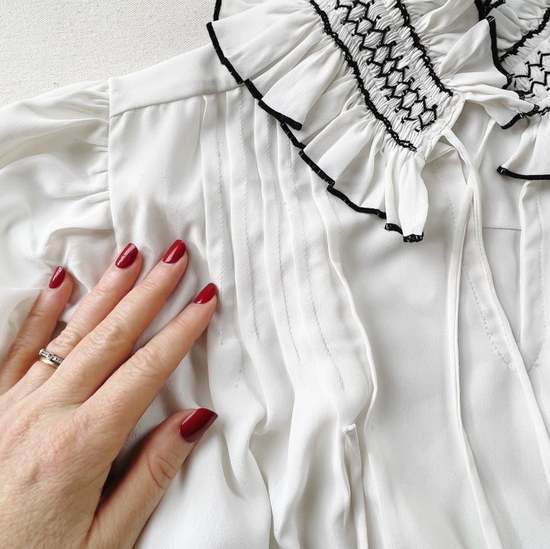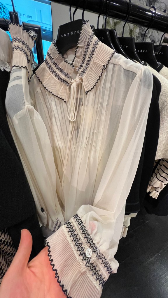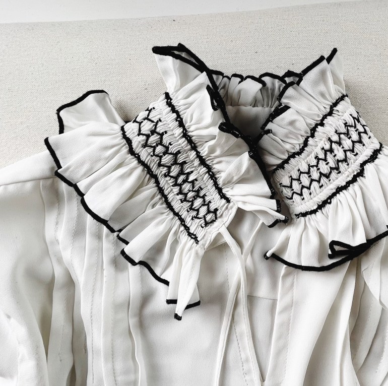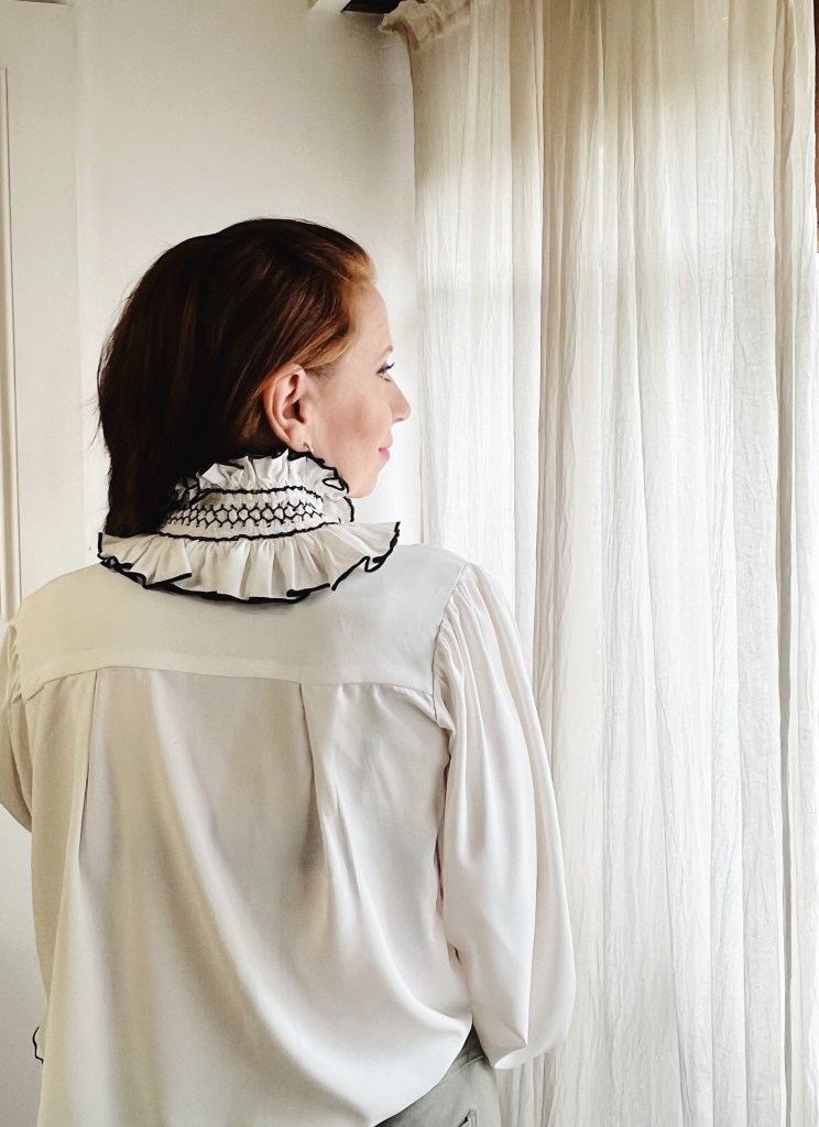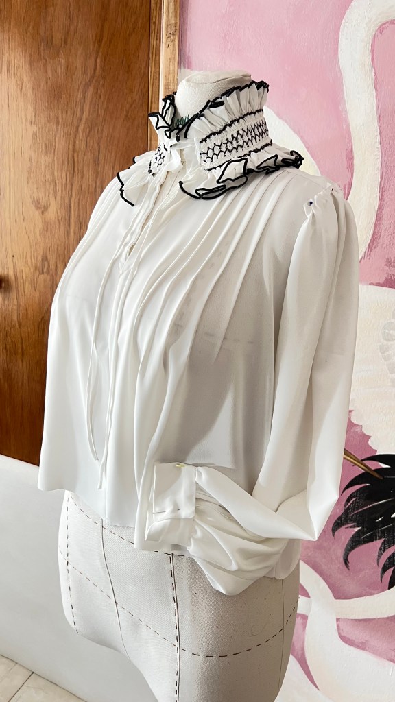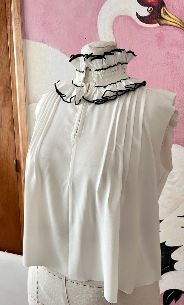 Es de la firma Sandro, en París y me fascinó todo: los detalles en punto smock, los pliegues, el contraste entre blanco y negro y el protagonismo de ese cuello alto. ¡Un amor! Así que al llegar a casa puse manos a la obra. Pero sabía que en este caso no iba a poder hacer algo igual igual ya que ese tipo de plizado solo se puede hacer a nivel industrial o por especialistas del tema.