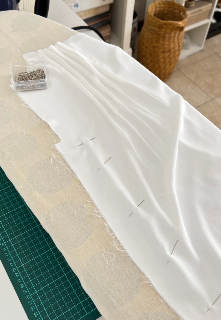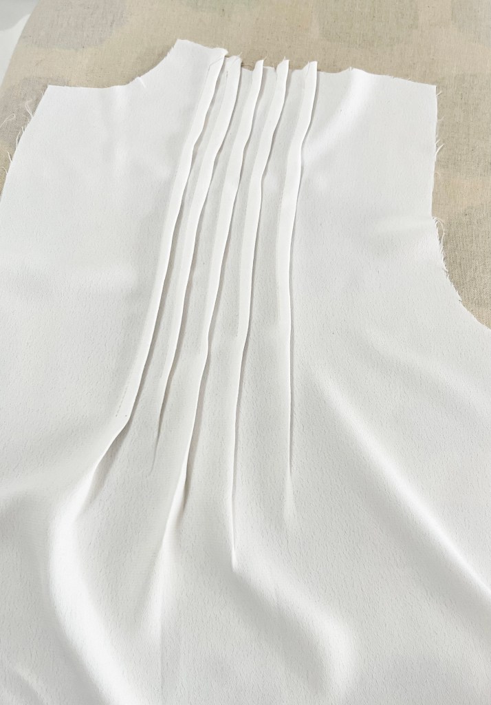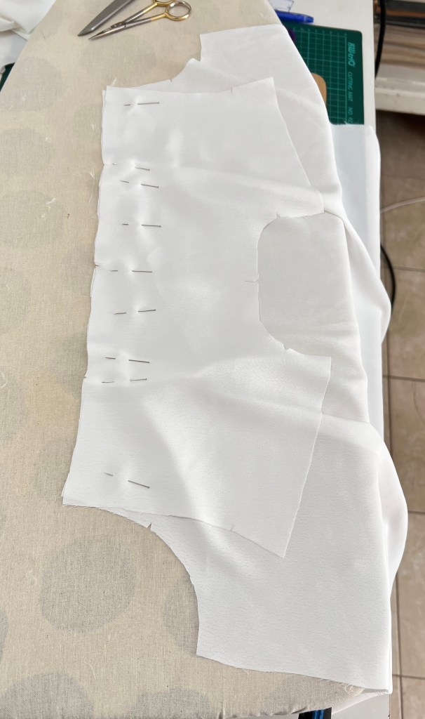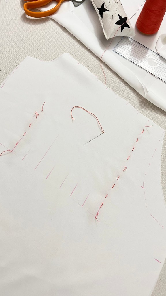 Una vez armado el cuello, continué con el frente de la blusa. Pasé las marcas de las alforzas y marqué las líneas de costura con un hilván.