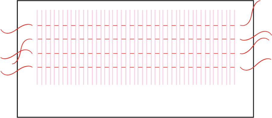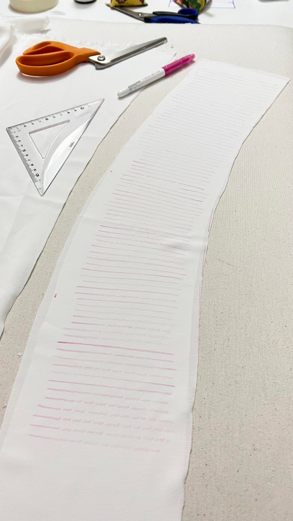 Sobre esta tira larguísima dibujé rayas cada medio centímetro con un marcador de los que se van con el calor de la plancha. Y cosí utilizando estas marcas para entrar y sacar la aguja en cada raya.