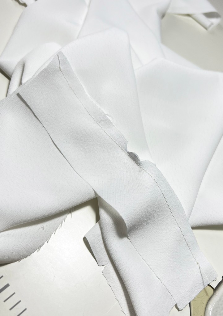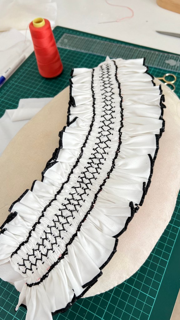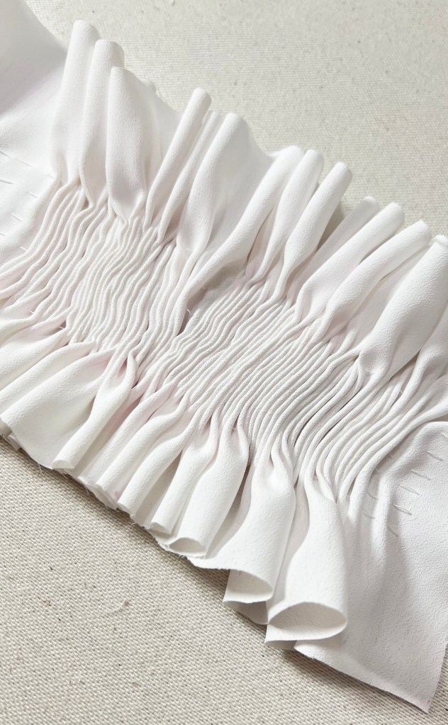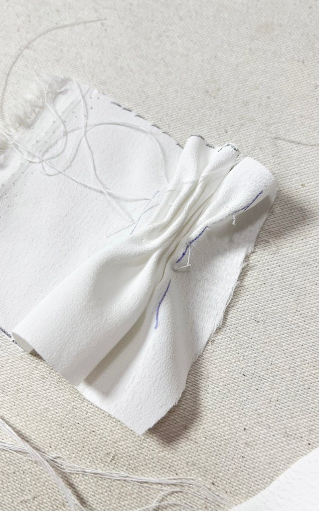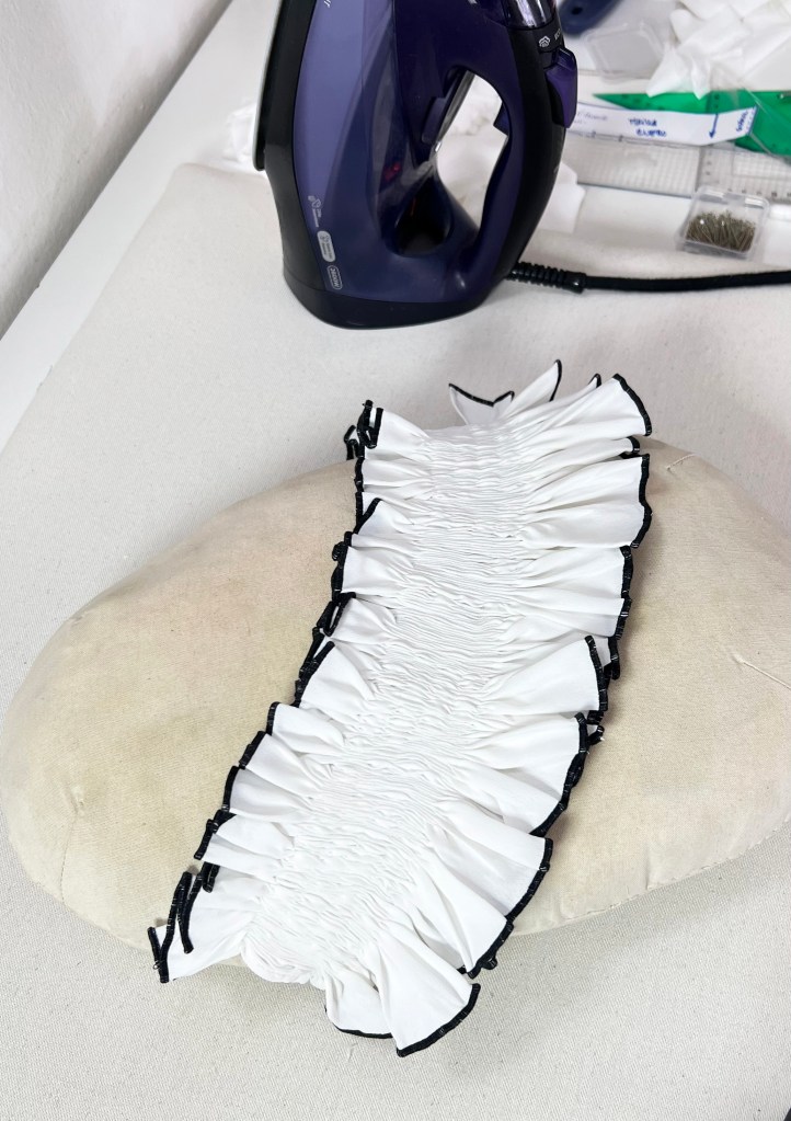 Comencé haciendo una prueba. Cosí varias hileras de hilván, dejando medio centímetro entre puntada y puntada y 1 centímetro entre cada línea. Fruncí todo y medí el resultado para calcular cuánta tela me iba a consumir este cuello:
