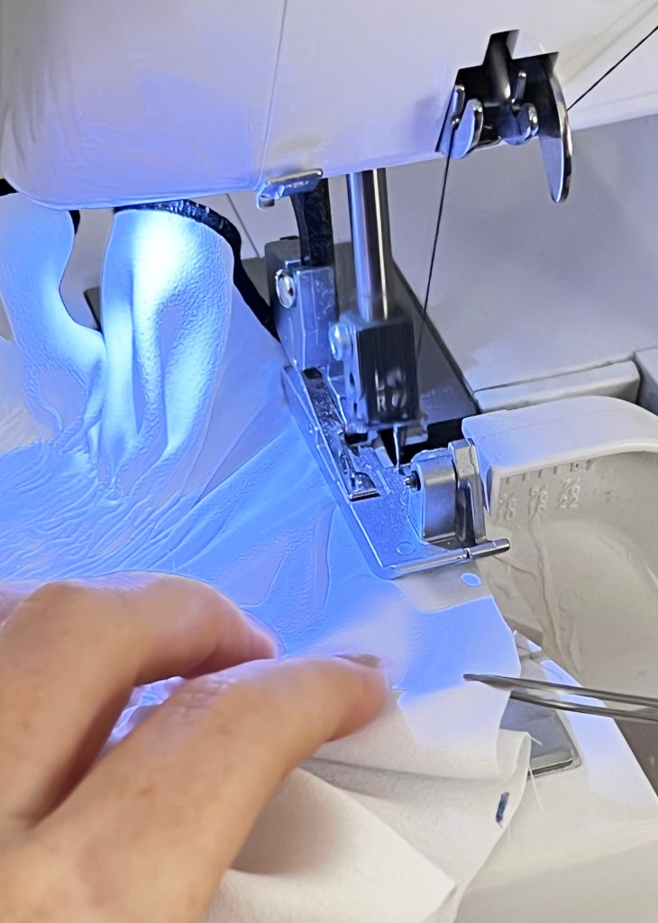 Una vez que todo estuvo fijo, pasé un pespunte todo al rededor a máquina con hilo blanco, para que se perdiera entre los frunces.