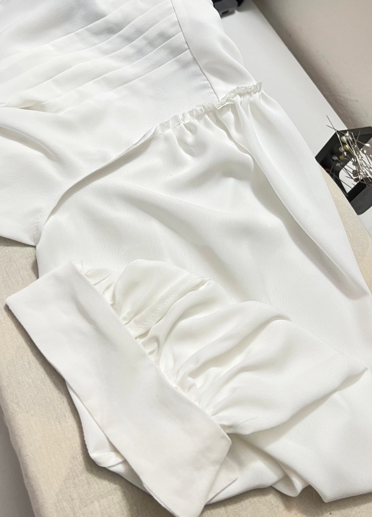 Finalmente cosí el borde interior del puño con puntadas invisibles. Luego fruncí la copa de sisa y ubiqué la manga sobre la prenda para probar que todo estuviera en buena posición: