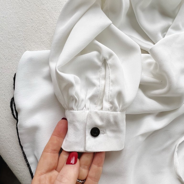 Una vez ok, cosí la manga al cuerpo por las sisas y tapé toda la costura con una cinta al bies. Luego hice los ojales de los puños y les cosí un pequeño botón negro. Así quedó la prenda por adentro: