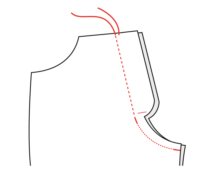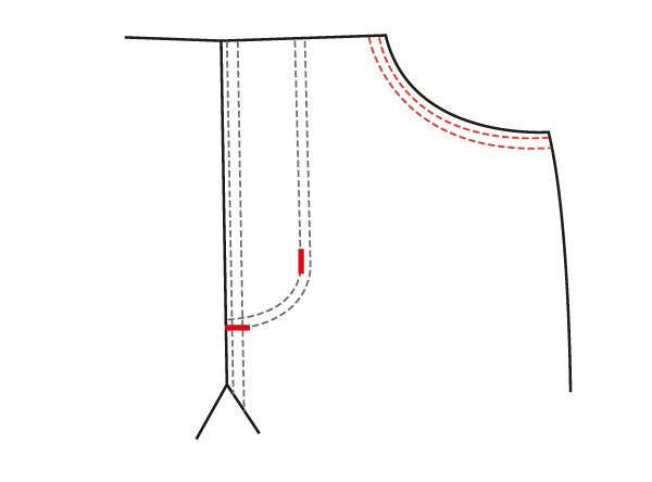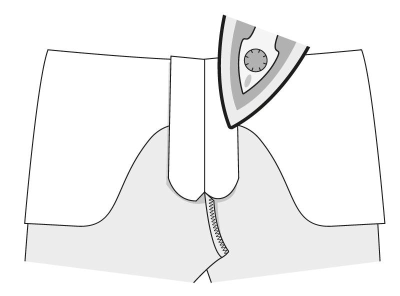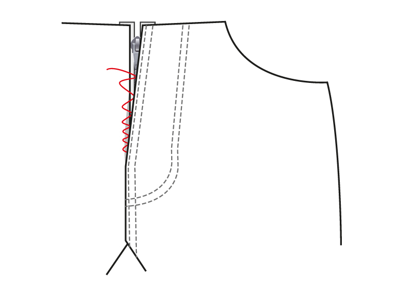 Antes de seguir, les quiero mostrar un dibujo para que vean cómo cierro la costura central del delantero. Tomo la medida del cierre (o cremallera) y la marco en la tela. Desde la cintura hasta esa marca, hago un pespunte a máquina con puntadas anchas y sin remate en el inicio. Desde el piquete hasta el final del tiro, hago lo opuesto: un pespunte más fuerte con un buen remate al principio y al final.