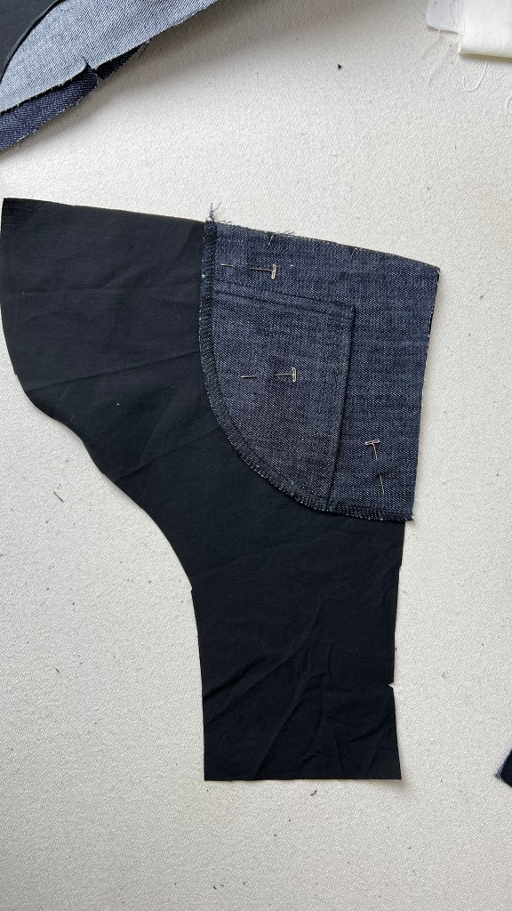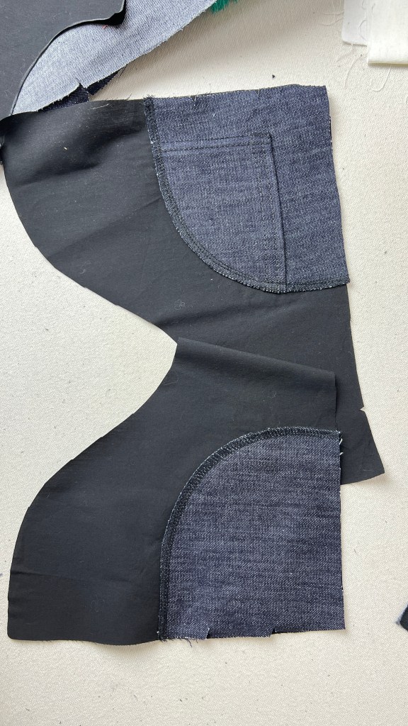 Coso con doble pespunte el margen lateral y luego termino todo el margen curvo con un surfilado de la overlock (puede ser también con zig zag de máquina recta). Entonces, lo ubico sobre el fondo de bolsillo (al que corté en un algodón camisero color negro: