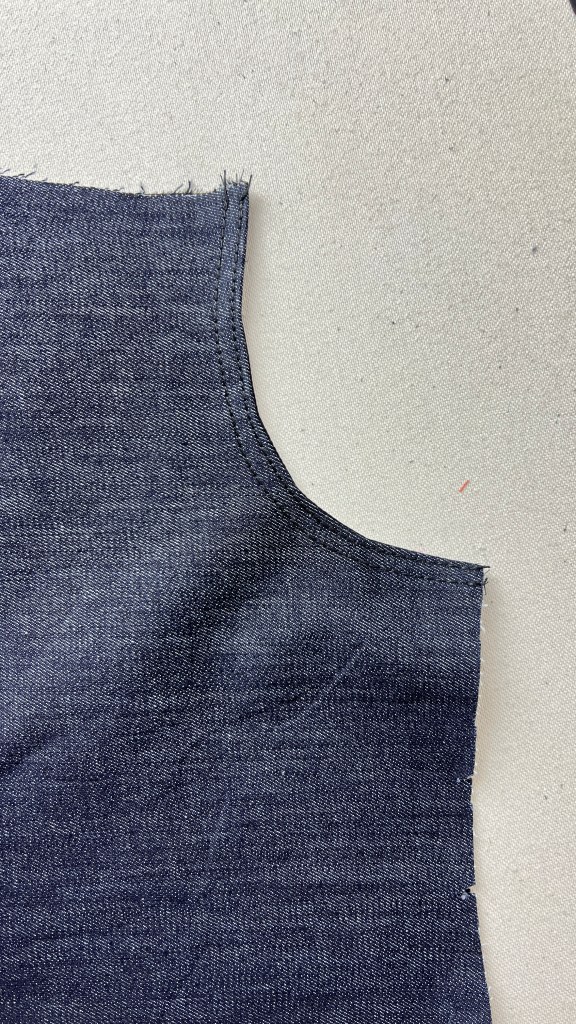Luego doy vuelta el margen que acabo de coser y hago un pespunte sobre el lado derecho de la vista.