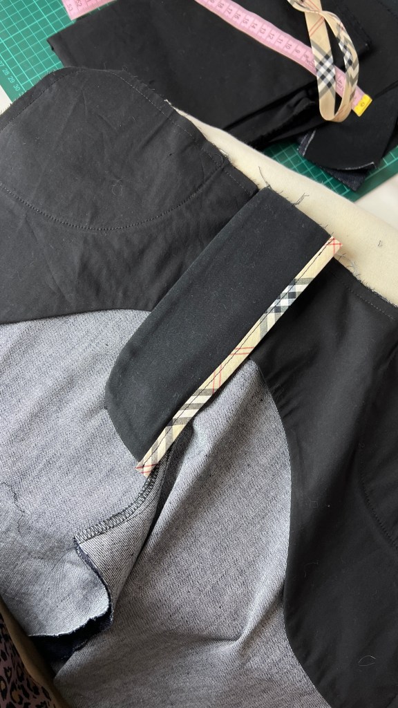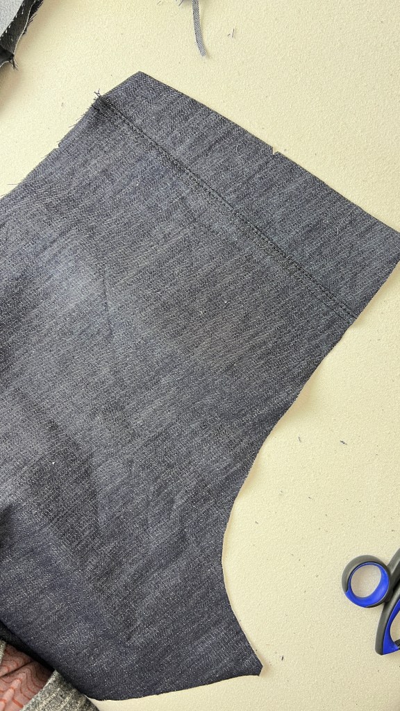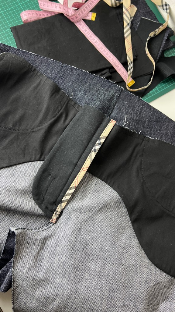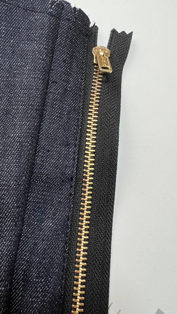 Como verán, los bolsillos llegan hasta la vista del cierre. Además, esta vista está reforzada con una entretela tejida fina. También, hago un pespunte liviano en el contorno superior y en el lateral para que el bolsillo no esté bailando por ahí durante toda la confección.