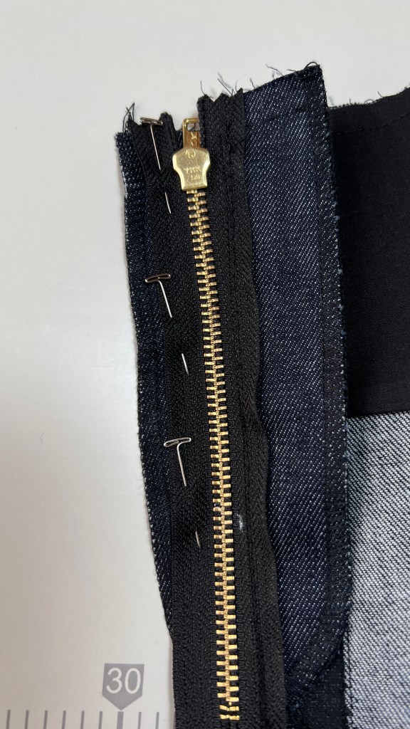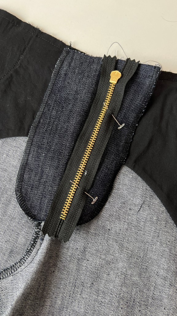Tomo con la punta de los dedos el margen del cierre que está sin coser y lo estiro todo lo que pueda hasta la otra vista. Lo fijo con alfileres y coso con un buen pespunte el cierre a la vista izquierda.