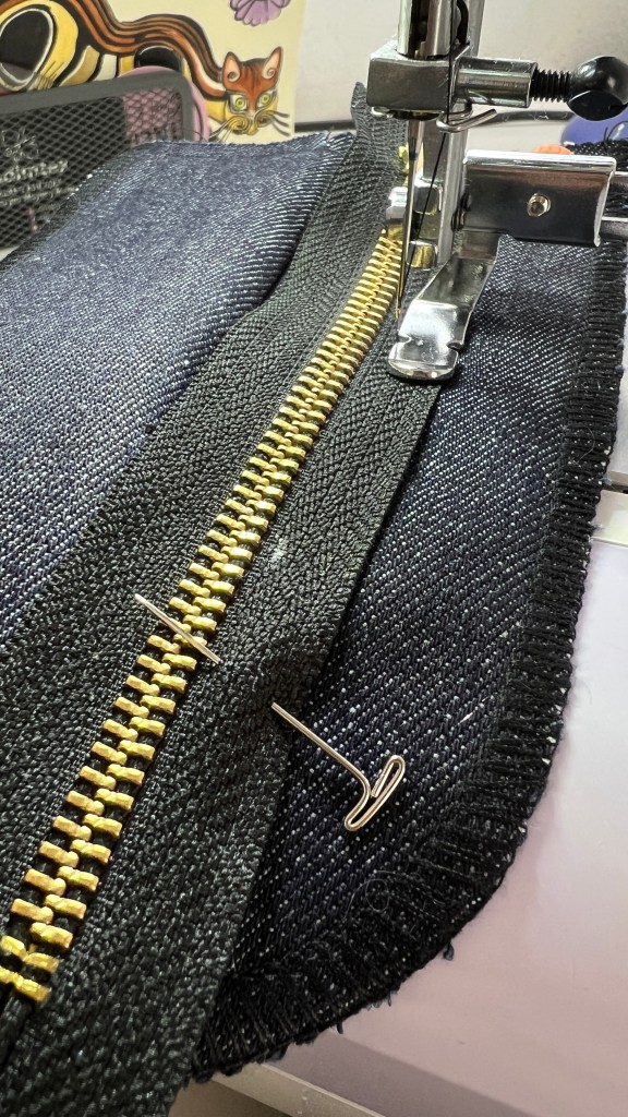 Una vez fijado el cierre, plancho todo y por el lado del derecho marco con un hilván (o una tiza) el recorrido del pespunte, del lado derecho. ¡Advertencia! Asegúrense de que la curva inferior no toca el tope de metal del cierre, o se van a acordar de mi. La costura tiene que pasar medio centímetro por debajo y llegar hasta el centro del tiro.