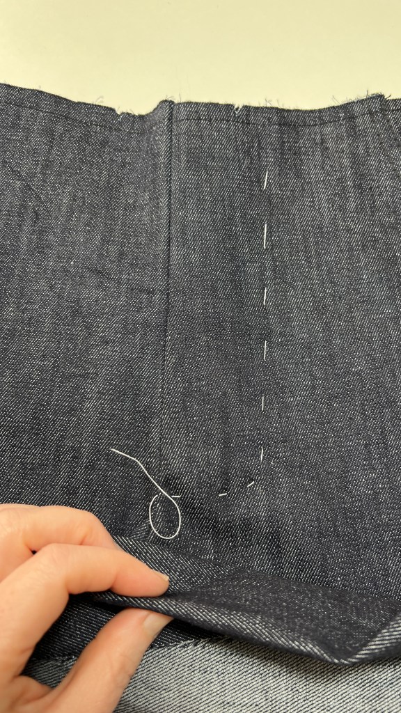 Una vez fijada la tapeta, hago un par de atraques en la zona inferior del pespunte, para fijar la punta inferior de la tapeta al pantalón y que no se mueva cada vez que nos lo ponemos.