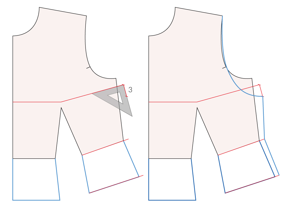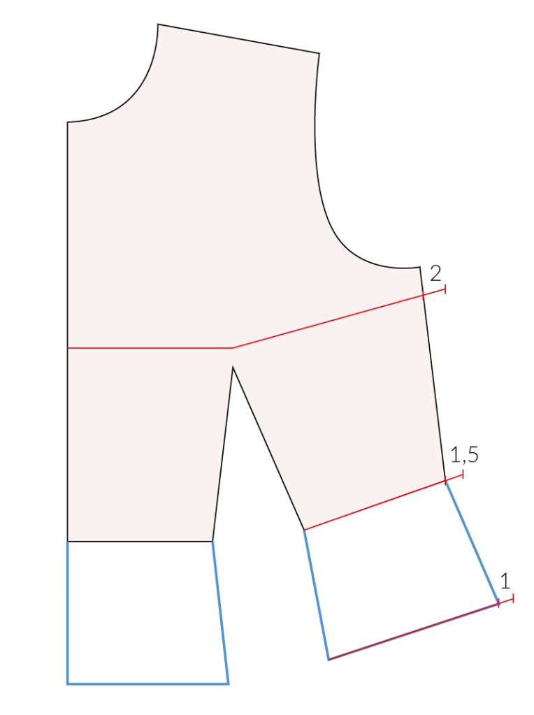 Tracen una línea horizontal en la base de copa. Marquen 10 ó 12 cm desde el centro de manga y tracen otra línea paralela al centro. Suban 4 cm por esta línea y marquen un punto. Unan el extremo superior de la raglan con este punto, usando una curva suave.