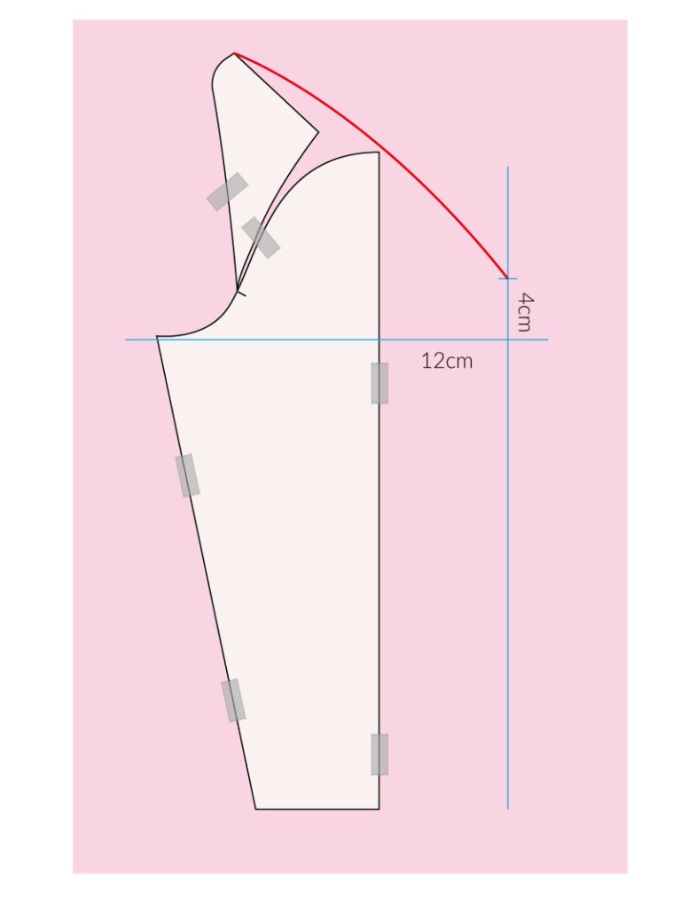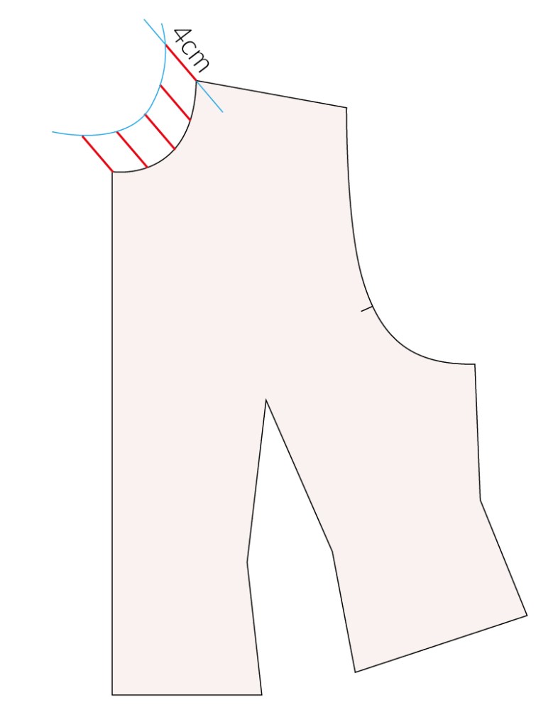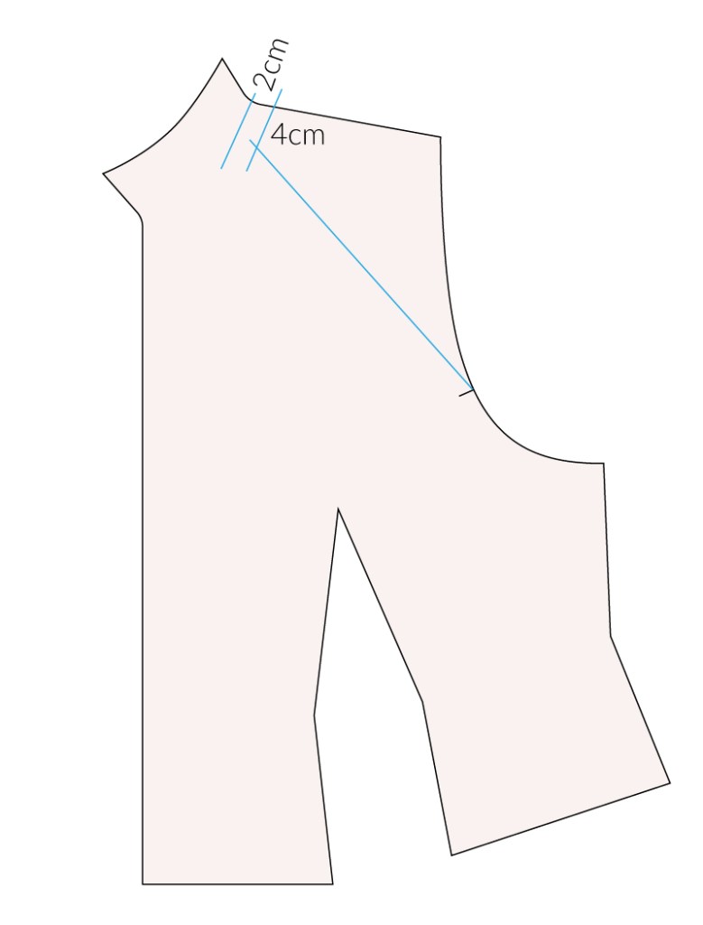 Comenzando por el delantero, continúen la línea de hombros en una diagonal no muy brusca. Midan 4 cm en esta diagonal y marquen puntos a 4 cm sobre la línea de escote. Tracen una línea curva uniendo los puntos y marquen la medida que tomaron del contorno superior del cuello.