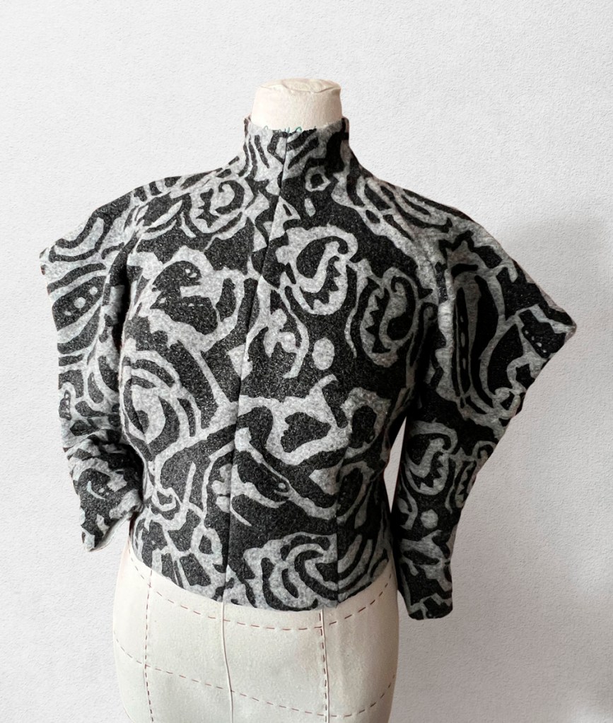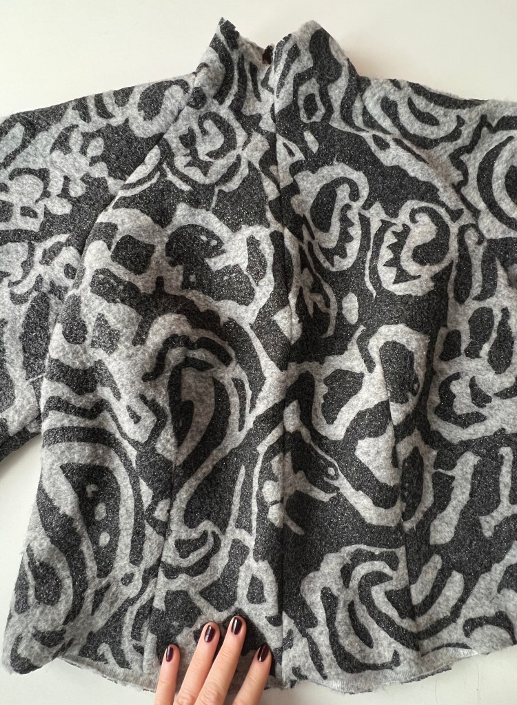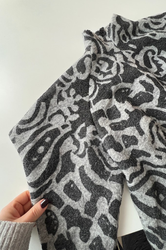 Y volví a casa feliz con un tejido muy tupido gris melange con dibujos estampados en gris oscuro y plateado ideal para reflotar la foto de Bottega Veneta: