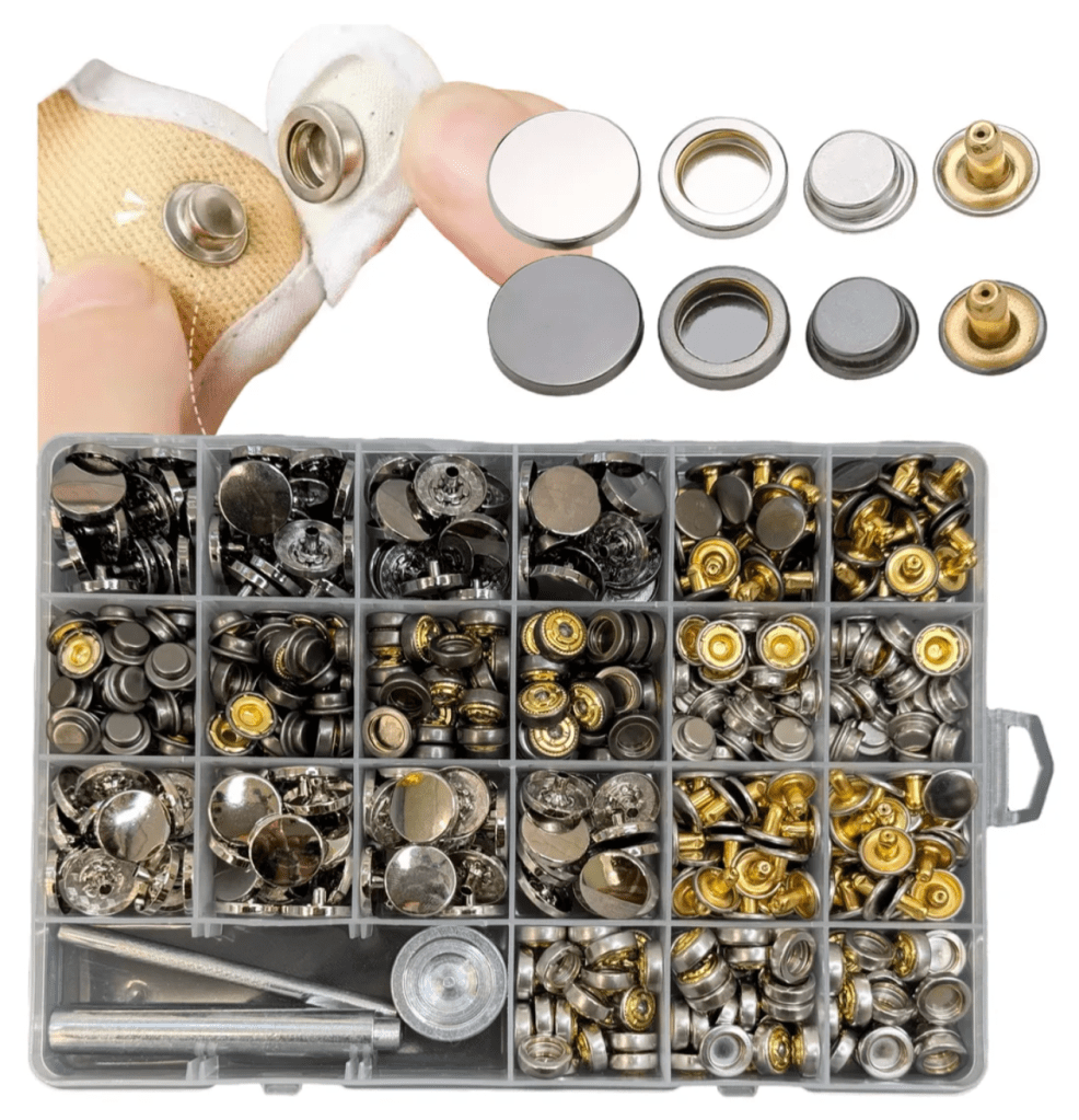 Estos son los broches favoritos para prendas de abrigo. Quedan muy vistosos y este juego que gustó por el diseño de los remaches. También vienen con su caja y matrices incluidas.