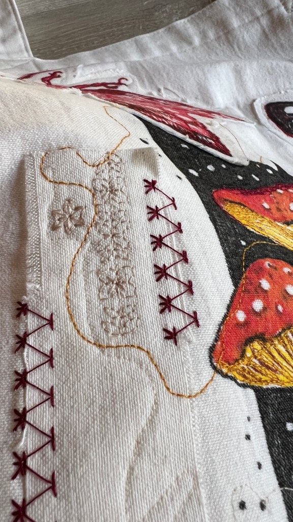 Fue entonces que salí a buscar algún tejido plano con cuerpo y encontré este Tusor de algodón en color crema. Para los estampados, resolví pintar apliques con marcadores para tela ¡es la primera vez que los uso y me fascinaron! Y encima me divertí un rato con la Janome 9450 y sus pies de bordado libre.